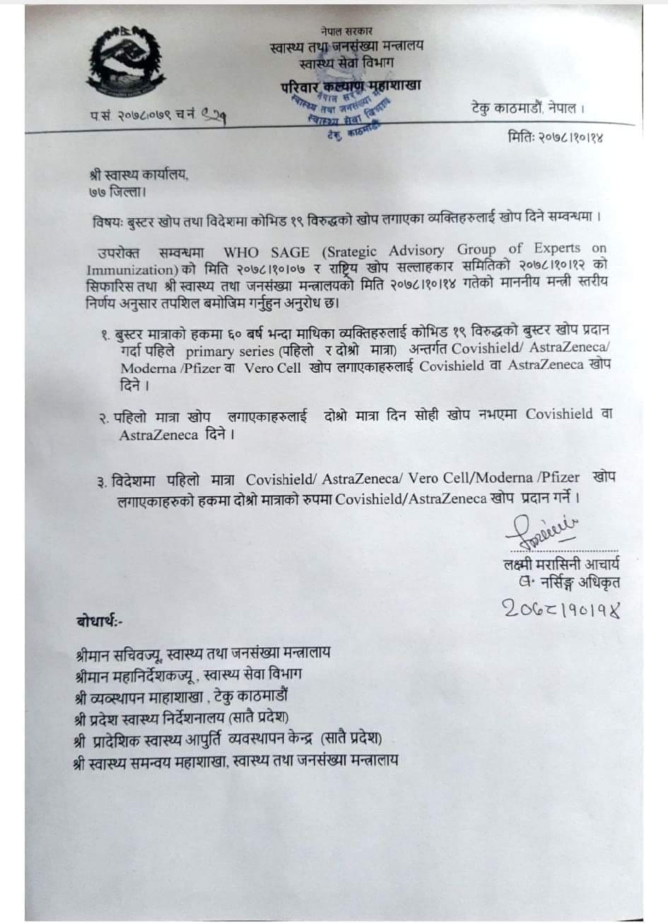 आज बसेको मन्त्रीस्तरीय निर्णय अनुसार ६० वर्ष माथिका व्यक्तिहरुलाई कोरोना विरुद्धको बुस्टर खोप प्रदान गर्दा पहिलो र दोस्रो अन्तर्गत कोभिशिल्ड, एस्ट्राजेनेका, मोर्डना, फाइजर वा भेरोसेल लगाएकालाई कोभिशिल्ड वा एस्ट्राजेनेका खोप दिइने भएको छ ।
