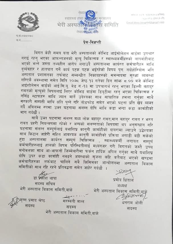 यी ३ जना प्रहरी नियन्त्रणमा रहेको र अन्यको संलग्नताको विषयमा थप अनुसन्धान गरि कानुनी कारवाहीको दायरामा ल्याउन किटानी जाहेरीसहित आवश्यक कानुनी कारबाहीको प्रक्रिया अगाडि बढी सकेकाले आन्दोलनरत सम्पूर्ण चिकित्सक, स्वास्थ्यकर्मी तथा कर्मचारीहरुलाई आ–आफ्नो जिम्मेवारीमा फर्कन अस्पताल विकास समितिले अपिल गरेको छ ।
