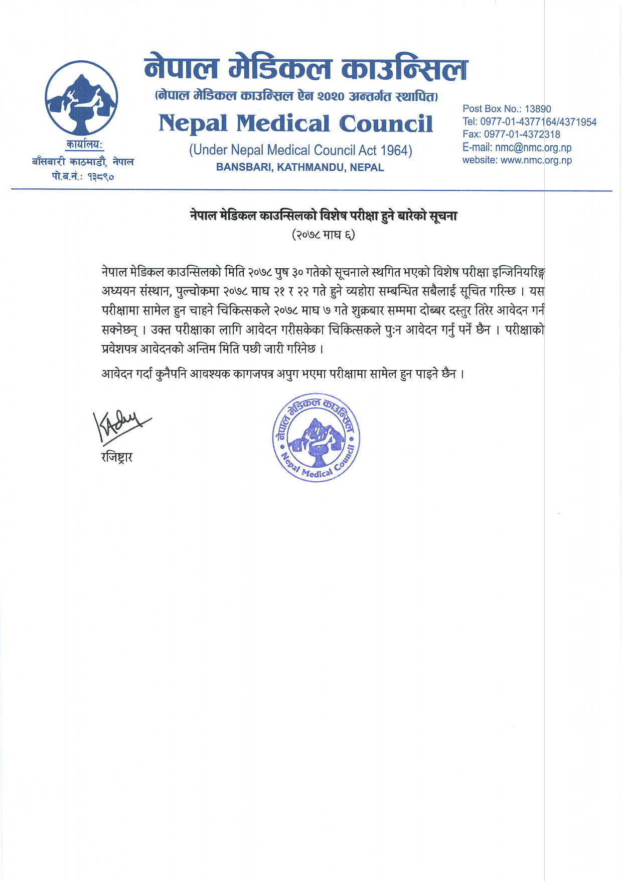 यसअघि स्थगित भएको नेपाल मेडिकल काउन्सिलको स्नातकोत्तर तहको विशेष परीक्षा माघ २१ र २२ गते हुनु भएको छ ।