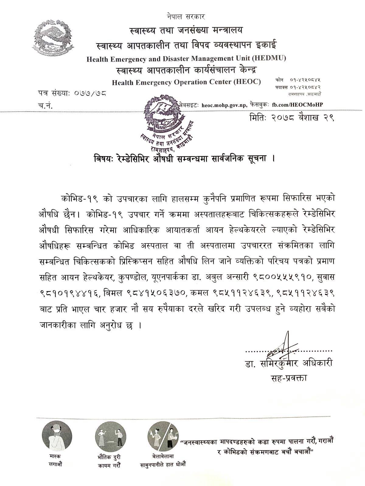 यदि कुनै व्यक्तिलाई रेम्डिसिभिर आवश्यक परे सम्बन्धित अस्पताल र चिकित्सकको पे्रस्क्रिप्सन लिएर आधिकारिक आयातकर्ता आयन हेल्थकियरमा जानुपर्नेछ ।