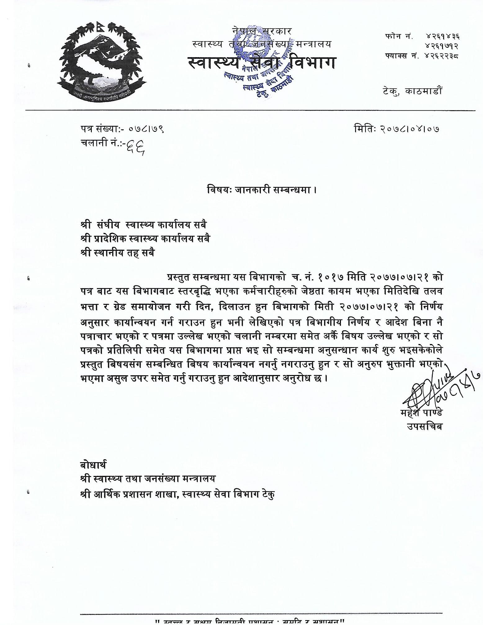 स्तरबृद्धि भएका कर्मचारीहरुको जेष्ठता कायम भएका मितिदेखि तलव भत्ता र ग्रेड समायोजन गरी दिन/ दिलाउन आदेशसहितको पत्र सार्वजनिक भएपछि स्वास्थ्य सेवा विभागले त्यो विभागिय निर्णय नभएको स्पष्ट पारेको छ ।