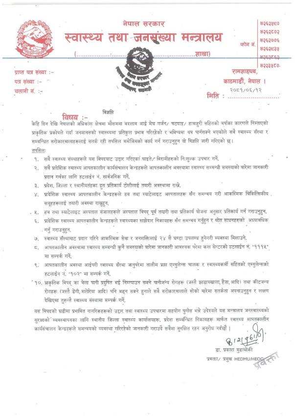 प्रदेश, जिल्ला र स्थानीयतहका द्रुत प्रतिकार्य टोलीलाई तयारी अवस्थामा राख्न, प्राकृतिक विपद्का बेला पानी प्रदुषित भई निम्त्याउन सक्ने पानीजन्य रोगहरू ९जस्तै झाडापखाला, हैजा आदि तथा कीटजन्य रोगहरू डेंगी, मलेरिया आदि बढ्न सक्ने हुनाले सबै सरोकारवालाले सोको बारेमा सतर्कता अपनाउनुहुन र लक्षण देखिएमा तुरुन्तै स्वास्थ्य संस्थामा सम्पर्क गर्न स्वास्थ्य मन्त्रालयले अपील गरेको छ ।