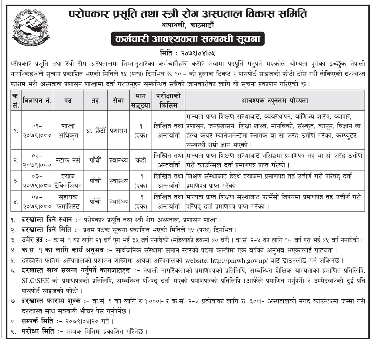 प्रसूतीगृह अस्पतालले एक जना शाखा अधिकृत, स्टाफ नर्स केही र अन्य प्यारामेडिक्सका लागि दरखास्त आव्हान गरेको छ ।