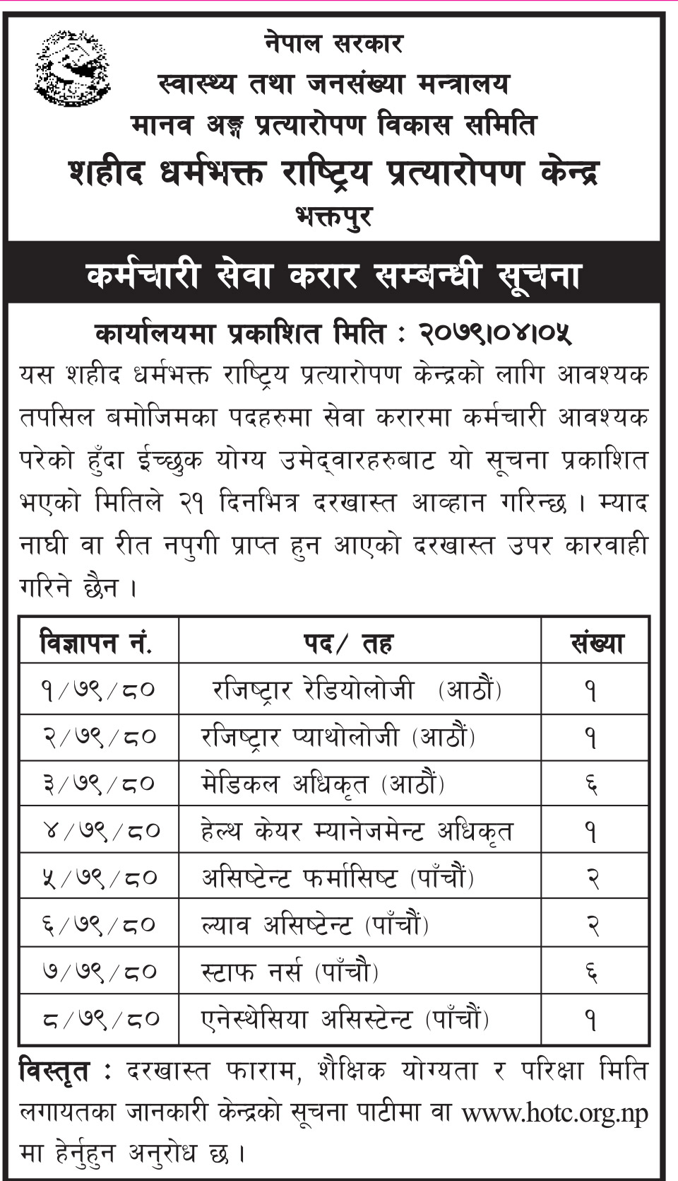 भक्तपुरस्थित शहीद धर्मभक्त राष्ट्रिय प्रत्यारोपण केन्द्रले कर्मचारी माग गरेको छ । केन्द्रले आज सूचना प्रकाशन गरी करारमा कर्मचारी नियुक्तिका लागि दरखास्त आह्वान गरेको हो ।