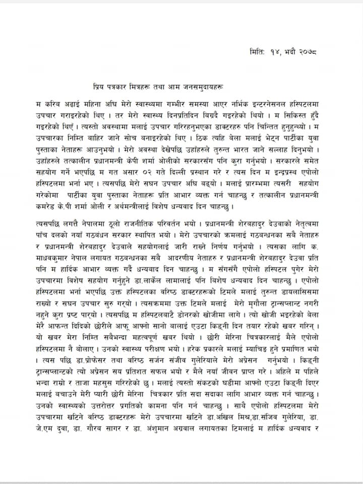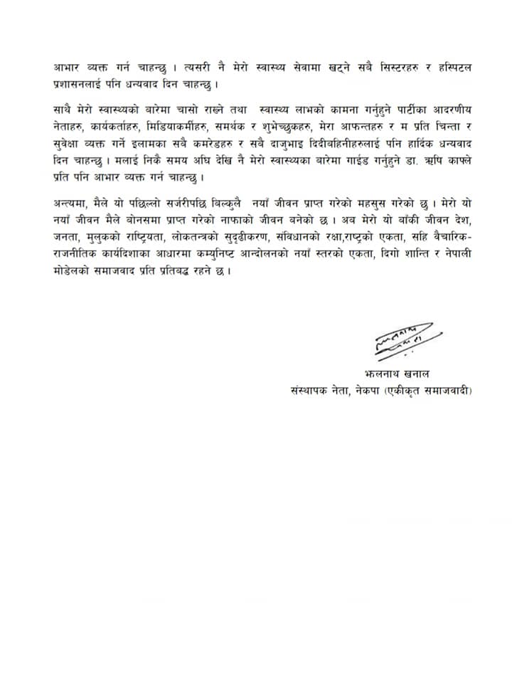 उहाँले बाँकी जीवन देश, जनता, मुलुकको राष्ट्रियता, लोकतन्त्रको सुदृढीकरण, संविधानको रक्षा,राष्ट्रको एकता, सहि वैचारिक राजनीतिक कार्यदिशाका आधारमा कम्युनिष्ट आन्दोलनको नयाँ स्तरको एकता, दिगो शान्ति र नेपाली मोडेलको समाजवाद प्रति प्रतिबद्ध रहेको बताउनुभएको छ ।
