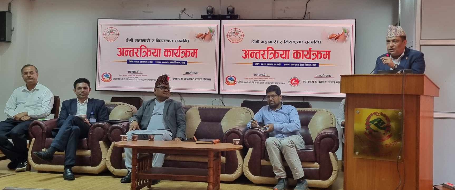 स्वास्थ्य पत्रकार मञ्च नेपालको आयोजना तथा इपिडिमियोलोजी (इडिसिडी)तथा रोग नियन्त्रण महाशाखाको सहकार्यमा भएको डेंगी महामारी र नियन्त्रण सम्बन्धि अन्तरक्रिया कार्यक्रममा स्वास्थ्य सचिव डा.रोशन पोखरेलले डेंगीको उपचार सरकारी अस्पतालहरुमा निशुल्क हुने जानकारी दिनुभयो । डेंगीको परिक्षण शुल्कलाई एकरुपता ल्याउन समिति बनाएर काम गर्ने तयारी भइरहेको जानकारी दिनुभयो ।