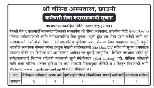 काठमाडौं, १२ फागुन । नेपाली सेनाले नर्ससहित विभिन्न पदमा जनशक्ति मागेको छ। वीरेन्द्र छाउनी अस्पतालमा हेमोडाइलासिस युनिटमा रहि काम गर्नका लागि अस्पतालले जनशक्ति मागेको हो ।
