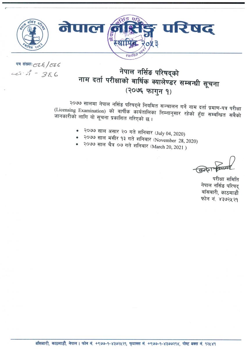 काउन्सिलले २०७७ मा पहिलो परीक्षा असार २०, दोस्रो परीक्षा मंसिर १९ र अन्तिम परीक्षा चैत ७ गते गर्ने निर्णय गरेको छ ।