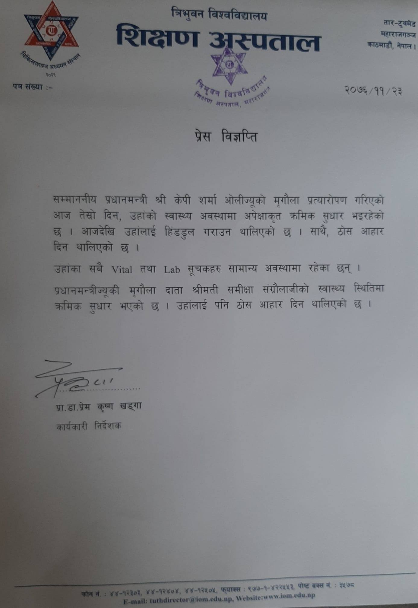काठमाडौं, २३ फागुन । प्रधानमन्त्री ओलीको मिर्गौला प्रत्यारोपण गरिएको आज तेस्रो दिन,उहाँलाई हिँड्डुल गराउन सुरु गरिएको छ । । उहाँको स्वास्थ्य अवस्थामा अपेक्षाकृत क्रमिक सुधार आएको त्रिवि शिक्षण अस्पतालले जनाएको छ । अस्पतालका निर्देशक डा.प्रेम खड्गाले विज्ञप्ति निकालेर प्रधानमन्त्रीलाई हिँडडुल गराउन थालिएको र ठोस आहार दिन सुरु गरिएको जानकारी गराउनुभएको छ । निर्देशक खड्गाले मुख्य तथा ल्याव सूचकहरु सामान्य अवस्थामा रहेको बताउनुभयो ।