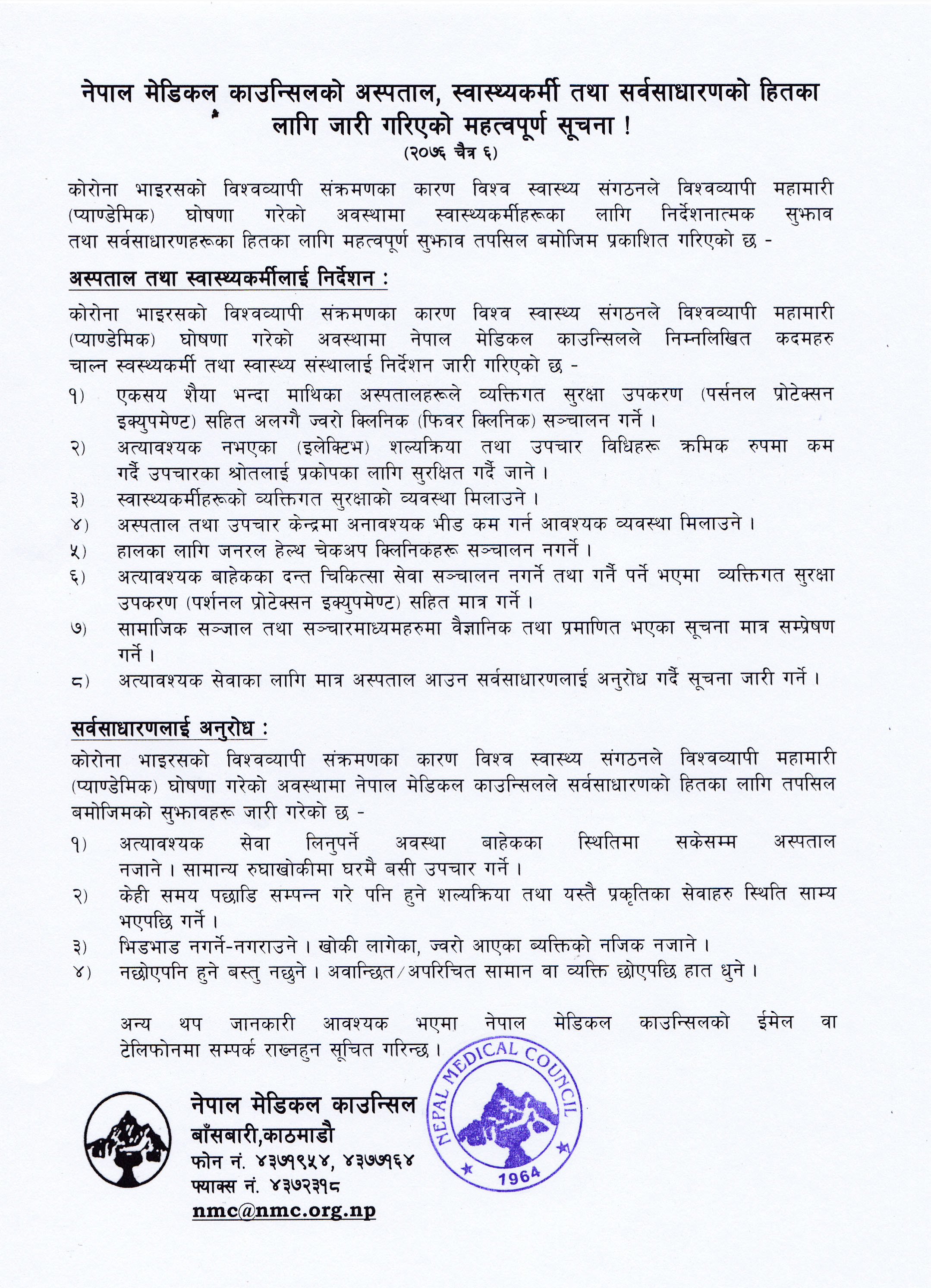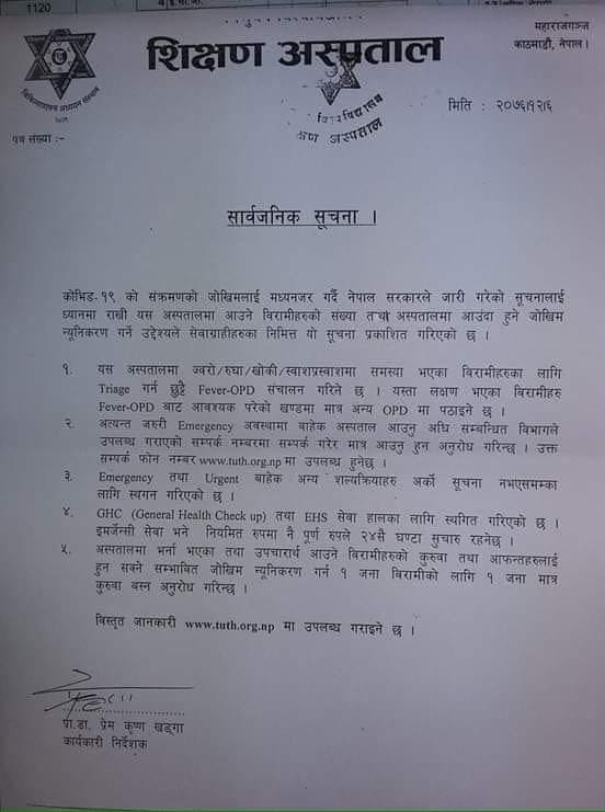यसैबीच काउन्सिलको निर्देशनात्मक सूचनापछि अस्पतालहरुले आफ्नो सेवामा कटौती गरेका छन् । शिक्षण अस्पताल महाराजगञ्जले सामान्य स्वास्थ्य परीक्षण बन्द गरेको छ । अस्पतालले सूचना जारी गरि अति आवश्यक अवस्थामा मात्र अस्पताल आउन आग्रह गरेको छ ।