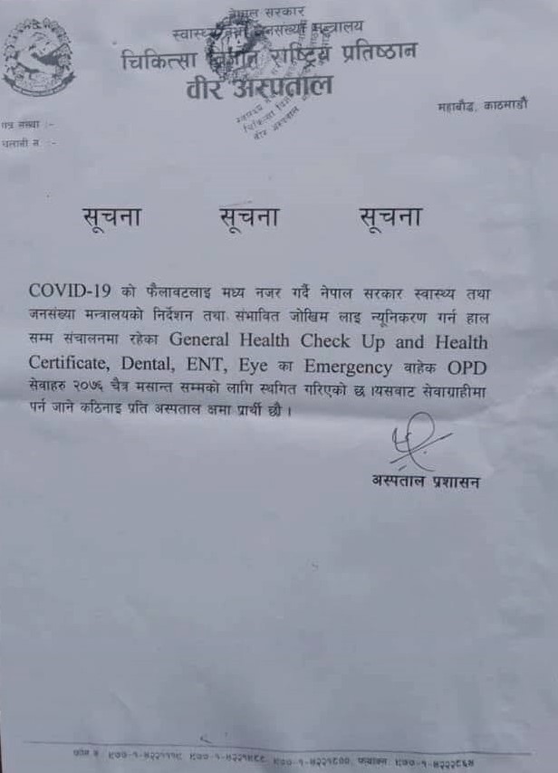 काठमाडौं, ८ चैत । कोरोना भाइरस फैलावटलाई मध्यनजर गर्दै वीर अस्पतालमा चैत मसान्तसम्म ओपिडी सेवा बन्द गरिएको छ । आकस्मिक बाहेकका जनरल हेल्थ चेकअप, स्वास्थ्य सर्टिफिकट, दन्तसेवा, नाक कान घाँटी आँखाका लगायतका सम्पूर्ण ओपिडी सेवा बन्द गरिएको अस्पतालले सूचना जारी गरि जानकारी दिएको छ ।