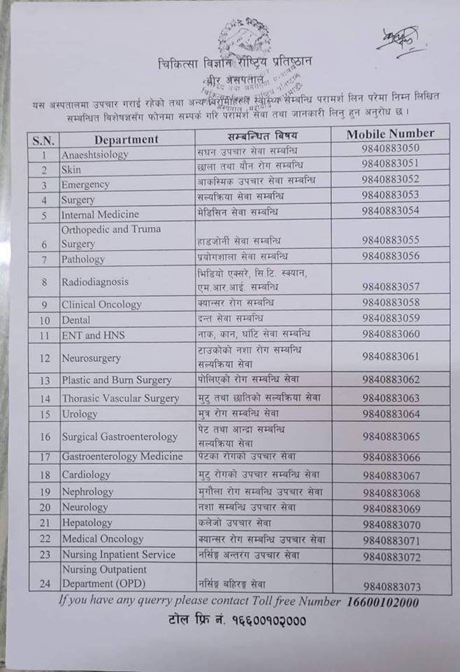 अस्पतालले मेडिसिन, हाडजोर्नी सेवा, नाक, कान, घाँटी, मुत्ररोग, पेटरोग, नशारोग, पेट रोग, टाउकोको नशा सम्बन्धी रोग, कलेजोरोग लगायतका रोगको लागि आवश्यक परामर्श गर्न सकिने जनाएको छ । अस्पतालले १६६००१०२००० टोल फ्रि नम्बरमा सम्पर्क गर्न सकिने जनाएको छ ।