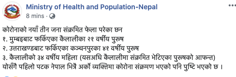 मन्त्रालयका अनुसार भारतको मुम्बईबाट फर्किएका कैलालीका २१ वर्षका पुरुष र उत्तराखण्डाबाट फर्किएका ४१ वर्षका पुरुष र कैलालीकी ३४ वर्षकी महिलालाई संक्रमणको पुष्टि भएको हो । ३४ वर्षकी महिला यसअघि कैलालीमा संक्रमित भेटिएका पुरुषको आफन्त रहेकी छन् । यो संगै पहिलोपटक नेपाल भित्रै अर्काे व्यक्तिमा कोरोना संक्रमण भएको पनि पुष्टि भएको छ । यसअघि देखिएका संक्रमितहरु कहाँ र कुन अवस्थामा छन् ।