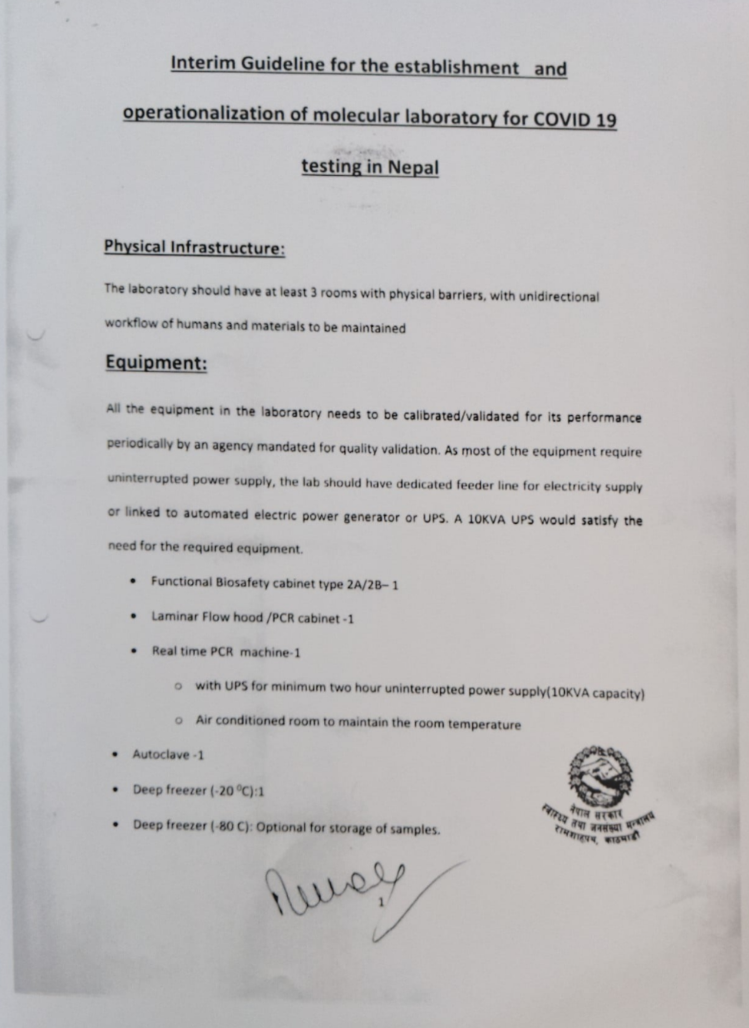 काठमाडौं,१५ बैशाख । स्वास्थ्य तथा जनसंख्या मन्त्रालयले कोरोना भाइरस रोग परीक्षण गर्ने प्रयोगशाला सञ्चालन सम्बन्धी अन्तरिम निर्देशिका जारी गरेको छ । मन्त्रालयको नियमित मिडिया ब्रिफिङमा प्रवक्ता डा. विकास देवकोटाले मापदण्ड पुरा गर्ने निजी प्रयोगशालालाई पनि कोरोना परीक्षण गर्ने बाटो खुलेको बताउनुभयो ।