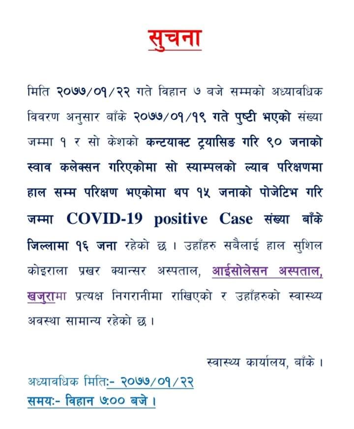 बाँकेमा १६ जनामा मात्रै कोरोना संक्रमण पुष्टि (स्वास्थ्य कार्यालयको विज्ञप्ति सहित)