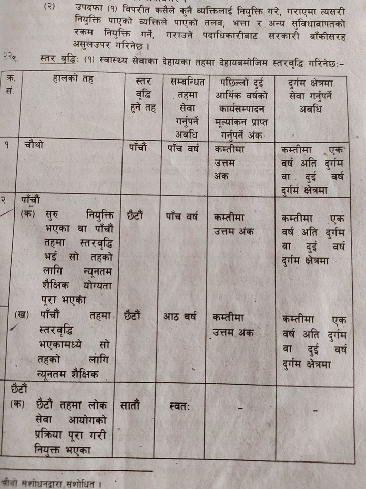 स्वास्थ्य सेवा ऐन अनुसार चौथो तहबाट पाचौ तहमा स्तरबृद्दि हुन सम्बन्धित तहमा पाँच वर्ष सेवा गरेको तथा कम्तिमा एक वर्ष अति दुर्गम वा दुई वर्ष दुर्गम क्षेत्रमा काम गरेको हुनुपर्छ । पाचौं तहबाट छैठौमा स्तरबृद्दि हुन योग्यताका आधारमा ५ देखि ८ वर्ष सम्बन्धित क्षेत्रमा सेवा गरेको तथा कम्तिमा एक वर्ष अति दुर्गम वा दुई वर्ष दुर्गम क्षेत्रमा काम गरेको हुनुपर्छ ।