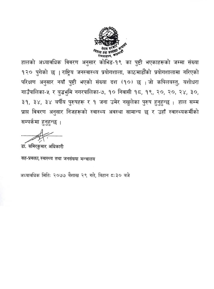 काठमाडौं,२९ बैशाख । थप १० जनामा कोरोना भाइरस संक्रमणको पुष्टि भएको छ । स्वास्थ्य तथा जनसंख्या मन्त्रालयले सोमबार बिहान जारी गरेको सूचनाअनुसार राष्ट्रिय जनस्वास्थ्य प्रयोगशाला टेकुमा गरिएको परीक्षणमा कपिलवस्तुका १० जनामा कोरोना पुष्टि भएको हो ।