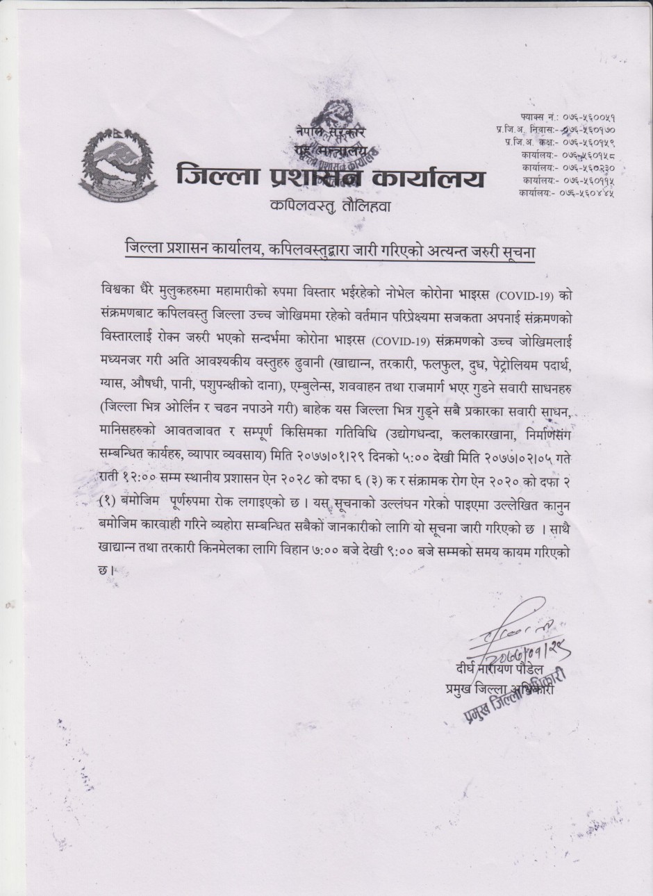 कपिलवस्तु,२९ बैशाख । कोरोना भाइरस रोगको संक्रमण बढ्दै गएपछि नियन्त्रणका लागि कपिलवस्तु जिल्लालाई जेठ ५ राती १२ बजेसम्म सिल गरिने भएको छ । जिल्ला सुरक्षा समिति वैठकले सोमबार साँझ ५ बजेबाट जिल्लालाई सिल गरिएको छ । पछिल्लो समय भारतबाट लुकिछपी आउने क्रम बढेको छ भने सीमा नाकामा २ हजार भन्दा बढी नेपालीबसिरहेका छन् ।