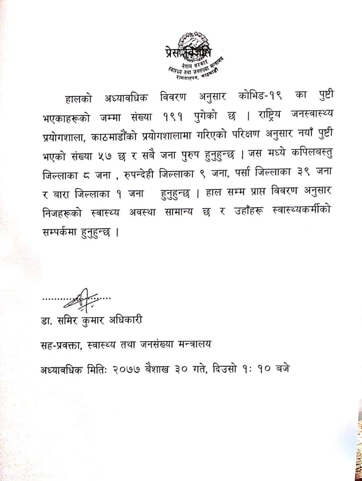 जसमा कपिलवस्तुका ८, रुपन्देहीका ९,पर्साका ३९ र बाराका १ जना रहेका छन् । यो संगै नेपालमा कोरोना संक्रमितको संख्या १९१ पुगेको छ ।