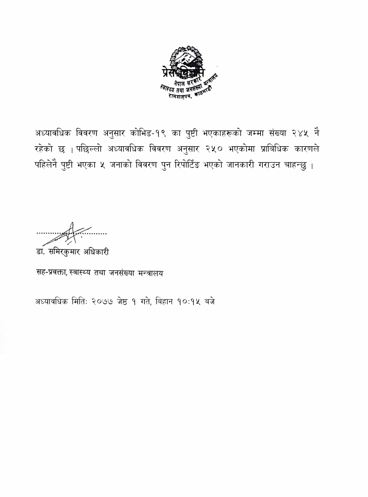 काठमाडौं । थप २ मा कोरोना भाइरस रोगको पुष्टि भएको छ । स्वास्थ्य मन्त्रालयले सच्याएको पछिल्लो सूचना अनुसार संक्रमितको संख्या २४५ पुगेको छ । यसअघि स्वास्थ्य मन्त्रालयले जारी गरेको सुचनाका आधारमा लेखिएको समाचारमा २४५ हुनपर्नेमा २५० भएकोमा सच्याइएको छ । हेर्नुहोस् मन्त्रालयले सच्याएको सूचना :