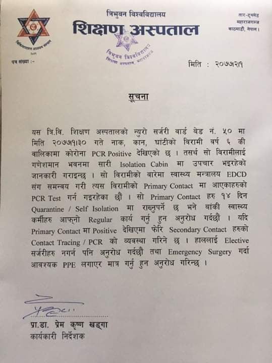 न्युरो सर्जरी वार्ड बेड नं.५० की बालिकालाई कोरोना(अस्पतालको विज्ञप्ती सहित)