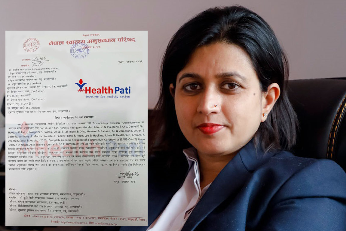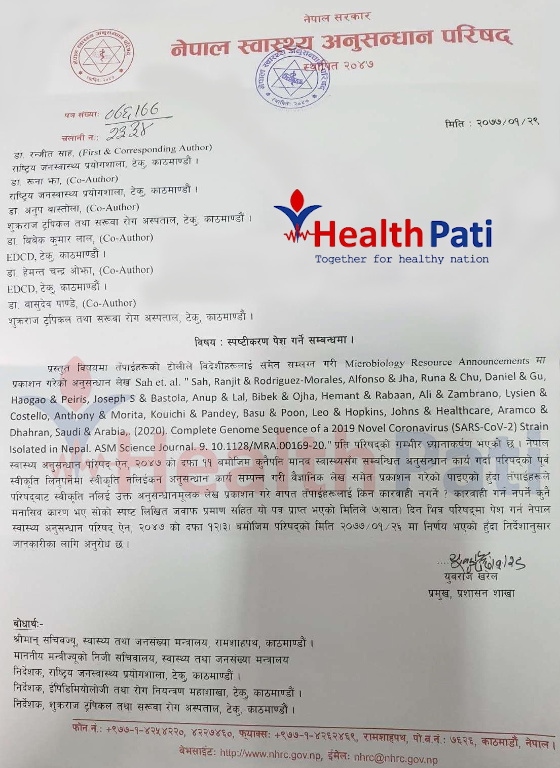 १२ मार्चमा प्रकाशित गरिएको उक्त जर्नलमा नेपालका तर्फबाट अनुसन्धानकर्ताको रुपमा राष्ट्रिय प्रयोगशालाकी निर्देशक डा. रुना झा, इपिडिमियोलोजी तथा रोग नियन्त्रण विभागका प्रमुख डा. बासुदेव पाण्डे, डा. विवेककुमार लाल,शुक्रराज ट्रपिकल तथा सरुवा रोग अस्पताल टेकुका डा. अनुप बाँस्तोला, डा. हेमन्तचन्दा ओझाको नाम समावेश गरिएको छ। ‘नेपालभित्र वा बाहिर कुनै पनि प्रयोगशालामा नेपालीको शरीरका अंग वा अन्य कुनै विषयका अनुसन्धान गर्नुपर्ने भए नेपाल स्वास्थ्य अनुसन्धान परिषदबाट स्वीकृति लिनु पर्ने व्यवस्था छ। कसैको स्वीकृतिबिना नै जर्नलमा लेख प्रकाशित गर्कपछि अहिले सो टिमलाई स्पष्टिकरण सोधिएको छ।