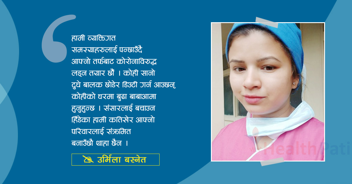 स्वास्थ्यकर्मीहरु संक्रमणको उच्च जोखिममा रहेका हुनाले उनीहरुको लागि अत्यन्त तनावपूर्ण स्थिति रहेको छ l म आफ़ैपनि एक नर्स हुँ l जब पहिलोपटक नेपालमा संक्रमण देखियो हामी एकदमै डराएका थियौ र भोलि आउनसक्ने स्थिती बारे चिन्तित थियौ l आफुलाई मानसिक रुपमा त तयार गर्यौ l PPE आउदैछ भनेर समाचारमा सुनिरहदा केहि राहत महसुस गरेका थियौ तर हामीले आज दिन प्रतिदिन बिग्रदो अवस्था संगसगै विभिन्न समस्याहरुका कारण तनावको स्थिती भोग्नु परिरहेको छ l अहिले कतिखेर कहा –कोबाट कोरोना संक्रमण हुने हो भन्ने डर त सामान्य लाग्न थालेको छ l हामी व्यक्तिगत समस्याहरुलाई पन्छाउदै आफ्नो तर्फबाट लड्न तयार छौ l