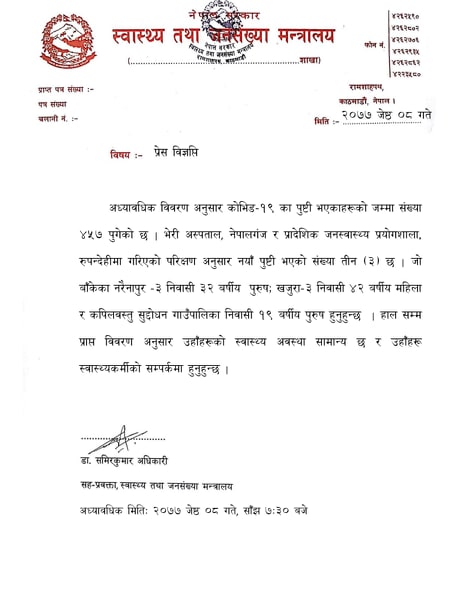 काठमाडौं । बाँकेमा पनि स्टाफ नर्सलाई कोरोना भाइरस रोगको पुष्टि भएको छ । केहीबेर अघि स्वास्थ्य मन्त्रालयले सार्वजनिक गरेको थप ३ संक्रमितमध्ये एक जना नर्स रहेको स्रोतले जानकारी दिएको छ ।