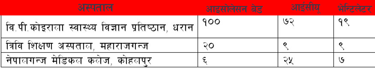 लेभल ३ मा अस्पतालमा शल्यक्रिया गर्नुपर्ने कोरोना संक्रमितजस्तै हातखु्टटा भाच्चिएको, ब्रेनमा समस्या रहेको, मुटुमा समस्या रहेको, गर्भवतीलगायतका विशेषज्ञ सेवा चाहिने कोरोना संक्रमितहरुको उपचार गर्नुपर्ने हुन्छ। अहिलेसम्म २ जना कोरोना संक्रमित लेभल–३ अस्पतालमा रहनुपर्ने पर्ने खालका पाइएको छ। एक जना मुटुमा समस्या र भएकी हेटौडाकी ५४ वर्षकी संक्रमित महिला जो शिक्षण अस्पतालको आइसीयू उपचाररत हुनुहुन्छ। उहाँको अवस्थामा केही सुधार आएको बताइएको छ।