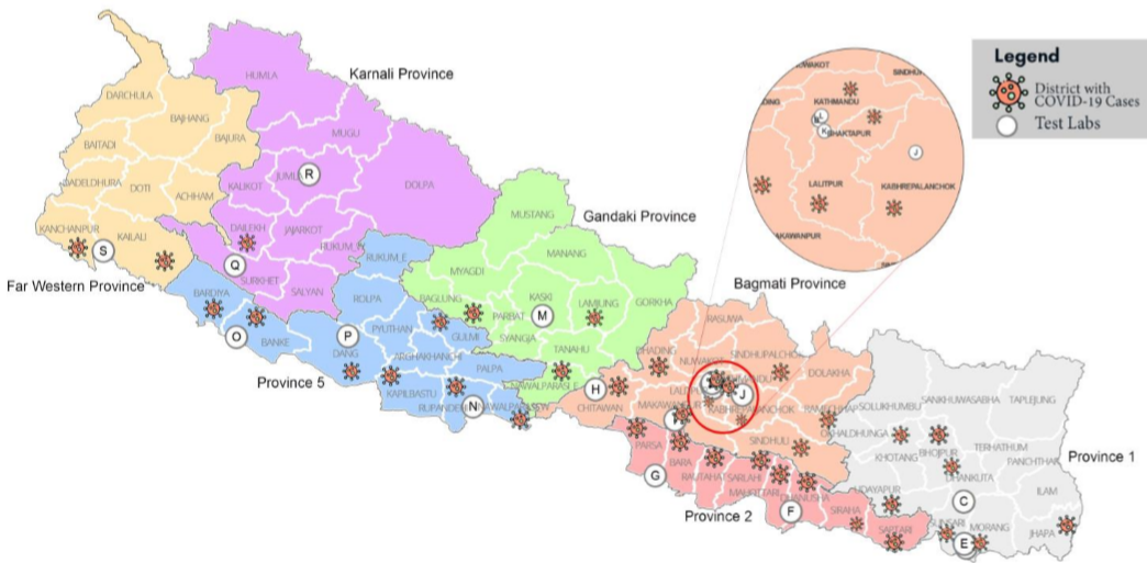 हालसम्म ४७ जिल्लामा कोरोना संक्रमण फैलिएको छ । कोरोनाबाट प्रदेश नम्वर २ अति प्रभावित भएको छ । प्रदेश नम्वर १ को ७ जिल्लामा १०३, प्रदेश नम्वर २ को ८ जिल्लामा ३२४, बागमती प्रदेशका ११ जिल्लामा १३, गण्डकी प्रदेशको ४ जिल्लामा १३, प्रदेश नम्वर ५को ९ जिल्लामा ३६५,कर्णाली प्रदेशको ३ जिल्लामा २५ र सुदुरपश्चिमका ५ जिल्लामा १७ जनालाई कोरोना संक्रमणको पुष्टि भइसकेको छ ।