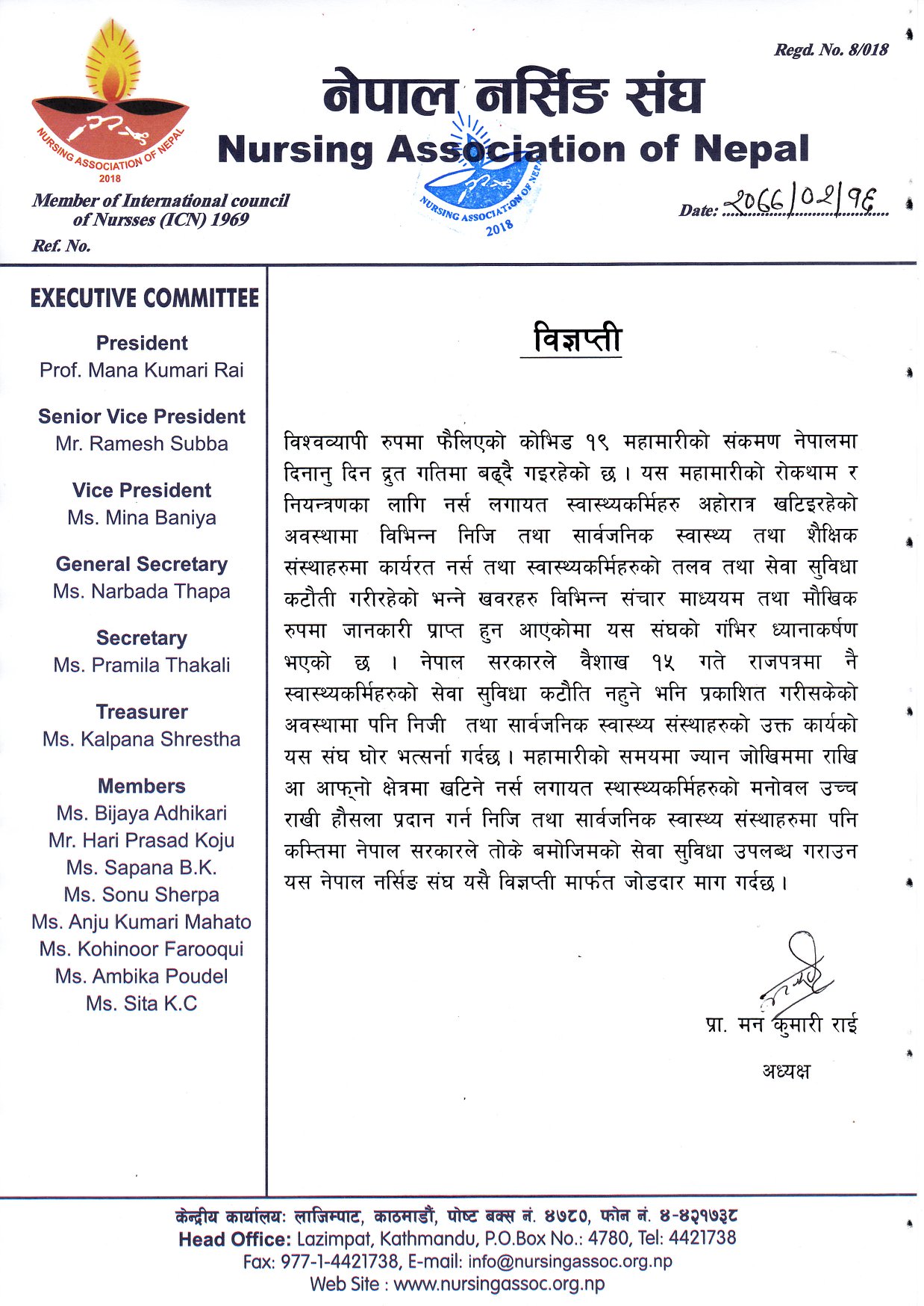 संघले विज्ञप्ती निकालेर कोरोना भाइरस रोगको महामारीको रोकथाम र नियन्त्रणका लागि नर्स लगायत स्वास्थ्यकर्मीहरु अहोरात्र खटिरहेको अवस्थामा विभिन्न निजि तथा सार्वजनिक स्वास्थ्य तथा शैक्षिक संस्थाहरुमा कार्यरत नर्स तथा स्वास्थ्यकर्मीहरुको तलव तथा सेवा सुविधा कटौती गरीरहेको भन्ने खवरप्रति आफ्नो गम्भिर ध्यानाकर्षण भएको जनाएको छ ।