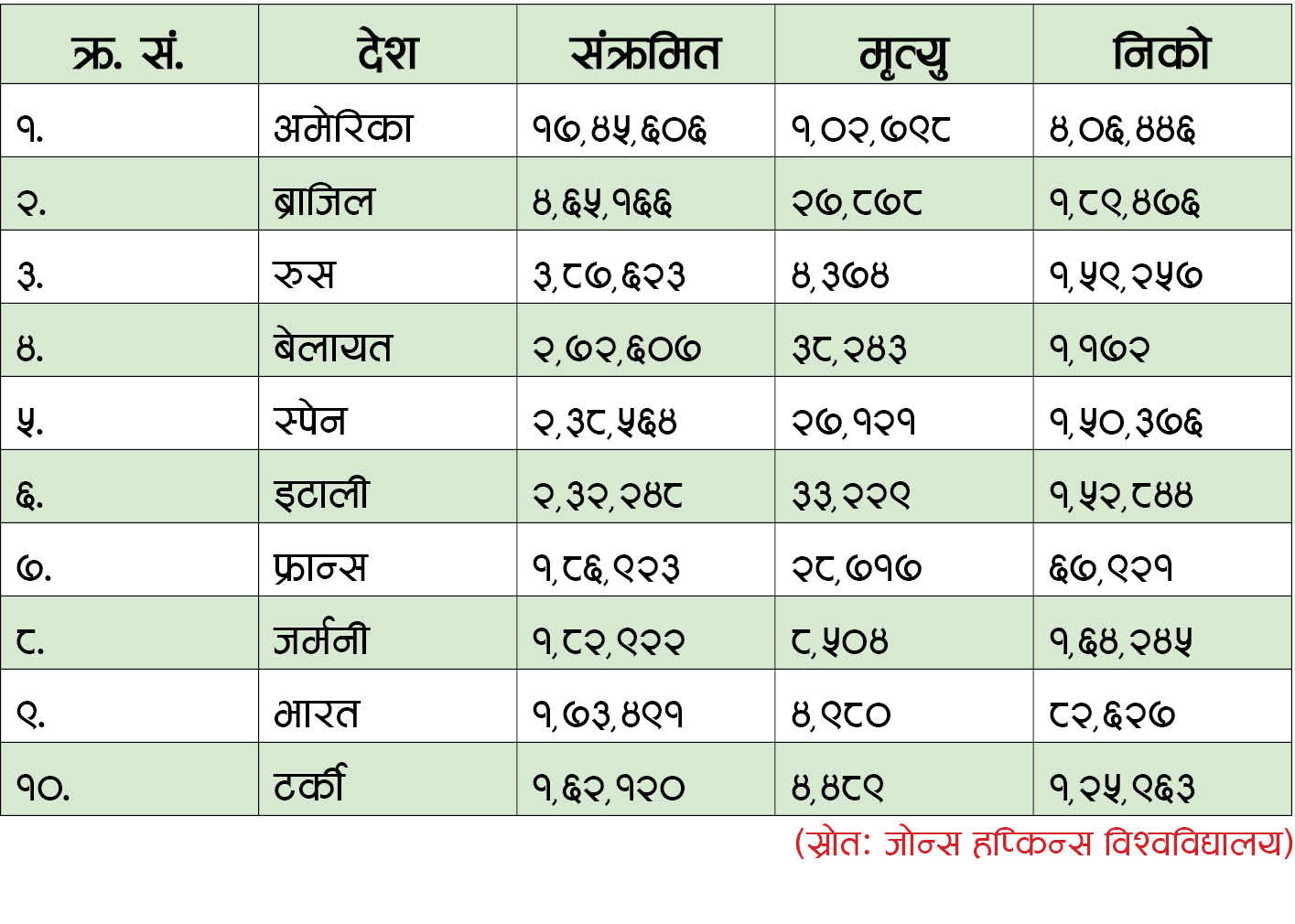 कोरानाबाट बढी संक्रमित हुने दस देश र आँकडा (तालिका)