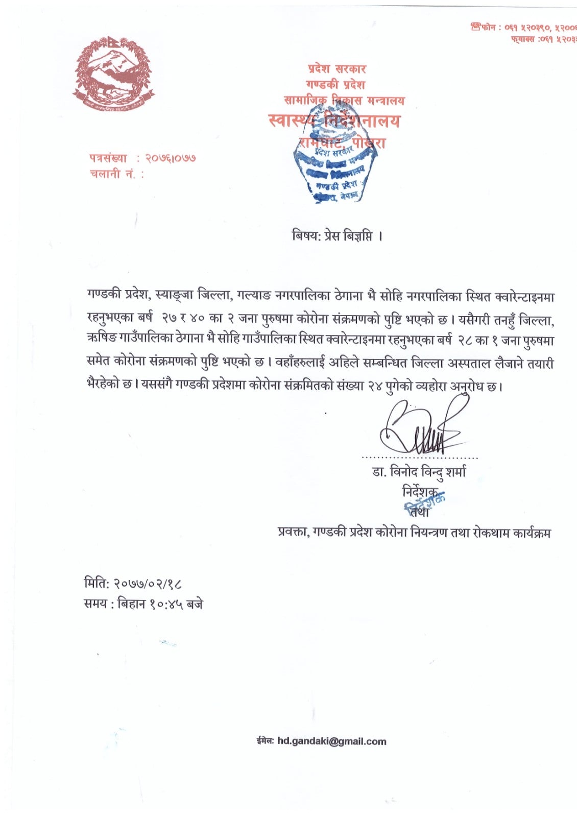 काठमाडौं । गण्डकी प्रदेशको तनुहँ र स्याङजा जिल्लामा गरि तीन जनालाई कोरोना भाइरस रोग (कोभिड १९)को पुष्टि भएको छ । सामाजिक विकास मन्त्रालय गण्डकी प्रदेशका अनुसार तनहुँ ऋषिङ गाउँपालिकाका २८ वर्ष र स्याङजा गल्याङका २७ र ४० वर्षका पुरुषलाई कोरोना पोजेटिभ देखिएको हो । यो संगै गण्डकी प्रदेशमा संक्रमितको संख्या २४ र देशभर १ हजार ४४९ जना पुगेको छ ।