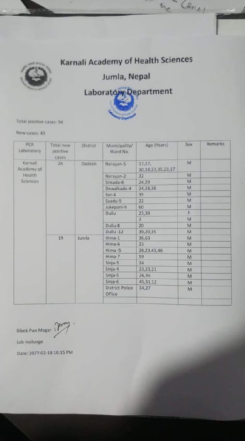 जुम्ला । कर्णाली प्रदेशको जुम्ला र दैलेखमा थप ४३ जनालाई कोरोना भाइरस रोग(कोभिड १९) को पुष्टि भएको छ । आइतबार राती १०:१५ बजेको अद्यावद्यिक अनुसार कर्णाली स्वास्थ्य विज्ञान प्रतिष्ठानको प्रयोगशालामा गरिएको परीक्षणमा जुम्ला हिमाका ८ र सिन्जाका ९ तथा दैखेखका २४ जना र जिल्ला प्रहरी कार्यालयका २ जना प्रहरी सहित ४३ जनालाई कोरोना पुष्टि भएको हो ।