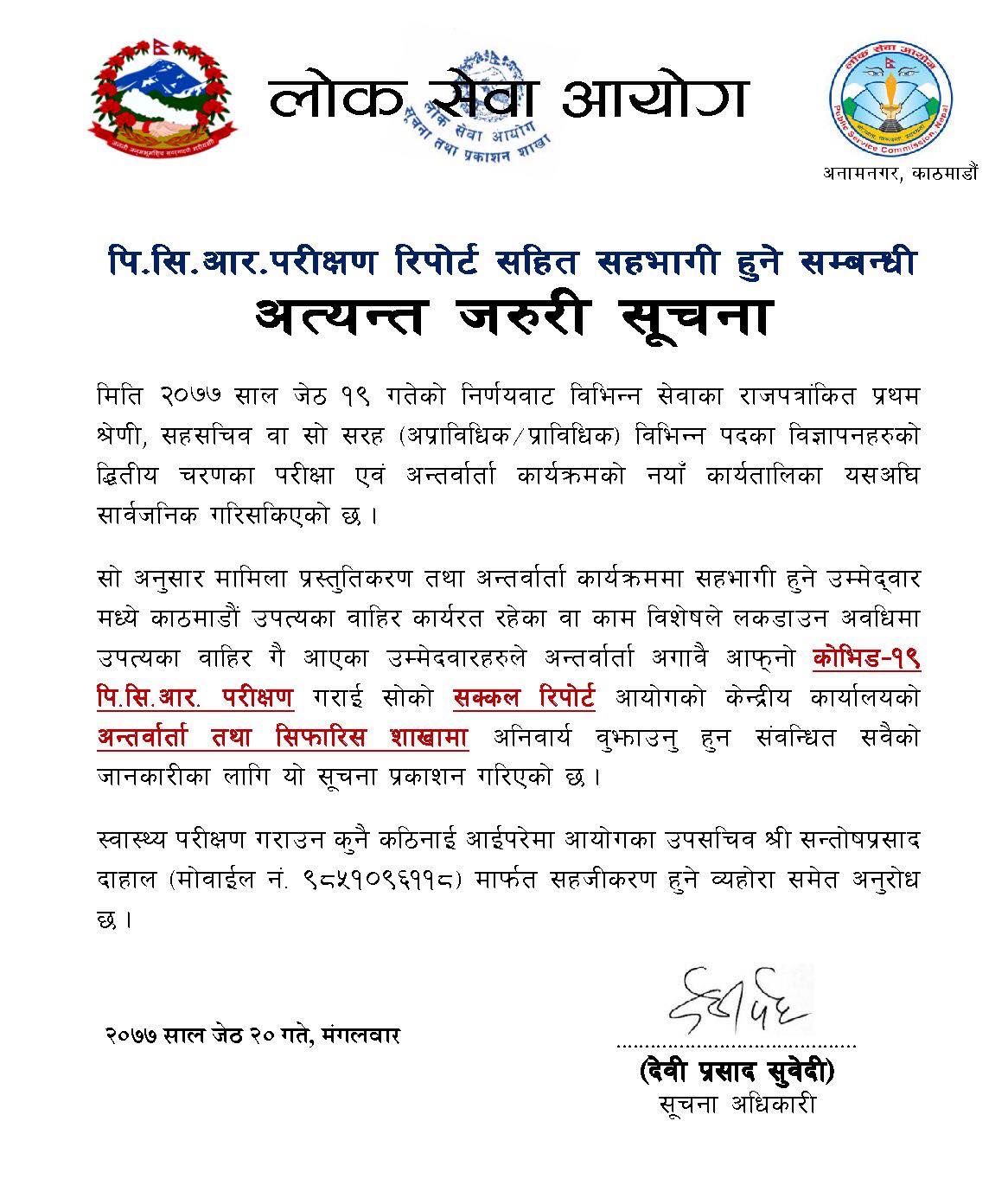 आयोगले सूचना जारी गरि मामिला प्रस्तुतिकरण तथा अन्तरवार्ता कार्यक्रममा सहभागी हुने उम्मेद्वार मध्ये काठमाडौं उपत्यका वाहिर कार्यरत रहेका वा काम विशेषले लकडाउन अवधिमा उपत्यका बाहिरबाट आएका उम्मेदवारहरुले अन्तर्वार्ता अगावै पीसीआर परीक्षण गर्नुपर्ने जनाएको छ । हेनुहोस् आयोगको सूचना :