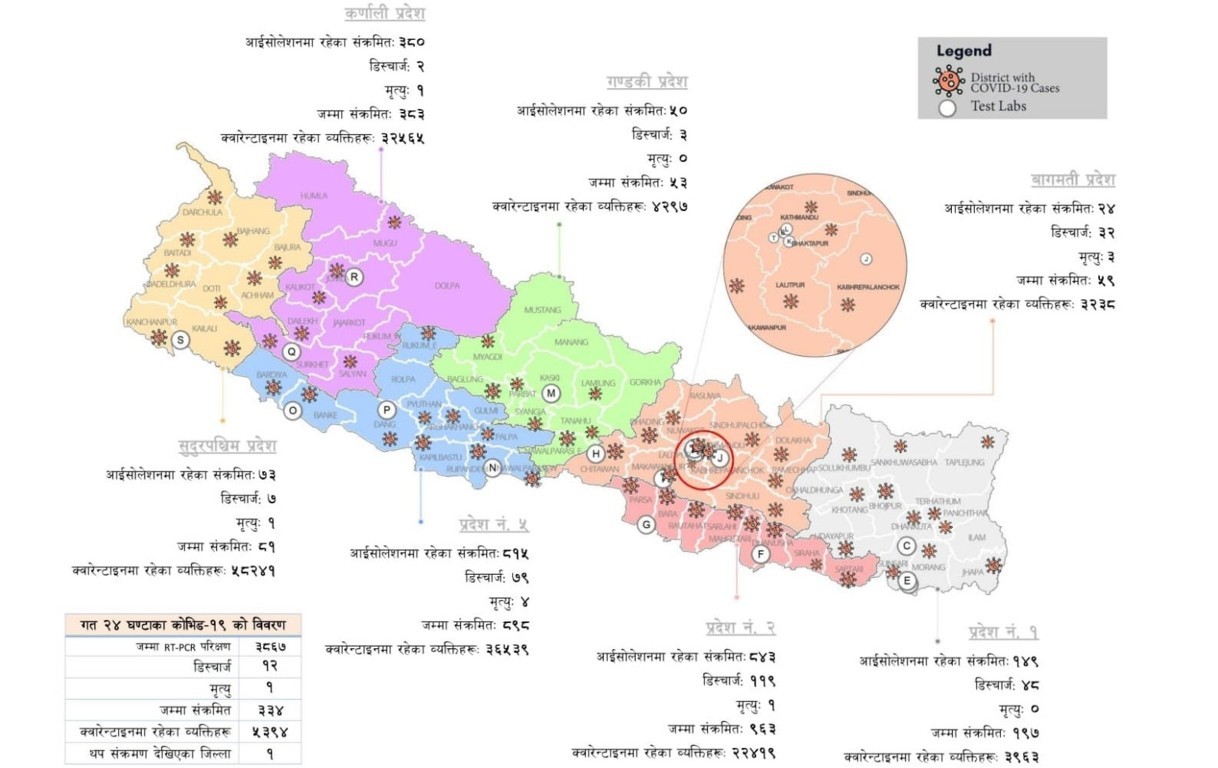 आज संक्रमण देखिएकामा मुगु जिल्ला थप भएपछि ६५ जिल्लामा संक्रमण फैलिएको छ । कोरोनाबाट प्रदेश नम्वर २ अति प्रभावित भएको छ, त्यहाँका सबै आठ जिल्लामा गरि ९६३ जनालाई कोरोना पुष्टि भएको छ ।