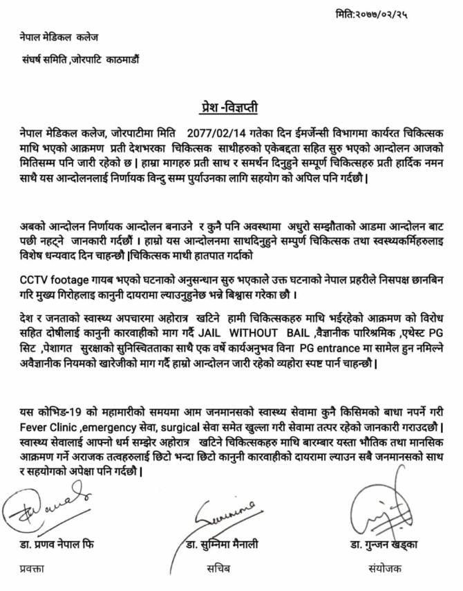 चिकित्सलाई दुर्व्यवहार गर्दै लाति र मुक्का हानेको अवधिको सिसिटिभी फुटेज लुकाउनेलाई कार्बाही गर्नुपर्ने, चिकित्सकको सुरक्षाको प्रत्याभुतीको ग्यारेन्टी गर्नुपर्ने लगायतका माग पुरा नभएसम्म आन्दोलन यथावत रहने आन्दोलन संयोजक गुञ्जन खड्काले जानकारी दिनुभयो ।प्रहरीले २ जनालाई नियन्त्रणमा लिएर अनुसन्धान थालेको बताएको छ ।