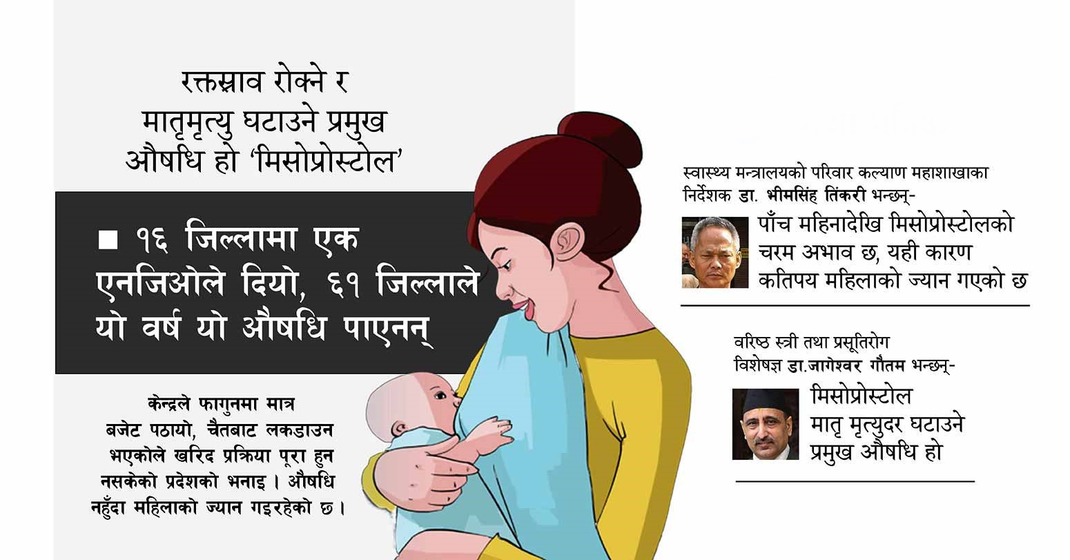 रक्तस्राव रोक्ने र मातृमृत्यु घटाउने प्रमुख औषधि हो ‘मिसोप्रोस्टोल’ । १६ जिल्लामा एक एनजिओले दियो, ६१ जिल्लाले यो वर्ष यो औषधि पाएनन् । केन्द्रले फागुनमा मात्र बजेट पठायो, चैतबाट लकडाउन भएकोले खरिद प्रक्रिया पूरा हुन नसकेको प्रदेशको भनाइ । औषधि नहुँदा महिलाको ज्यान गइरहेको छ ।
