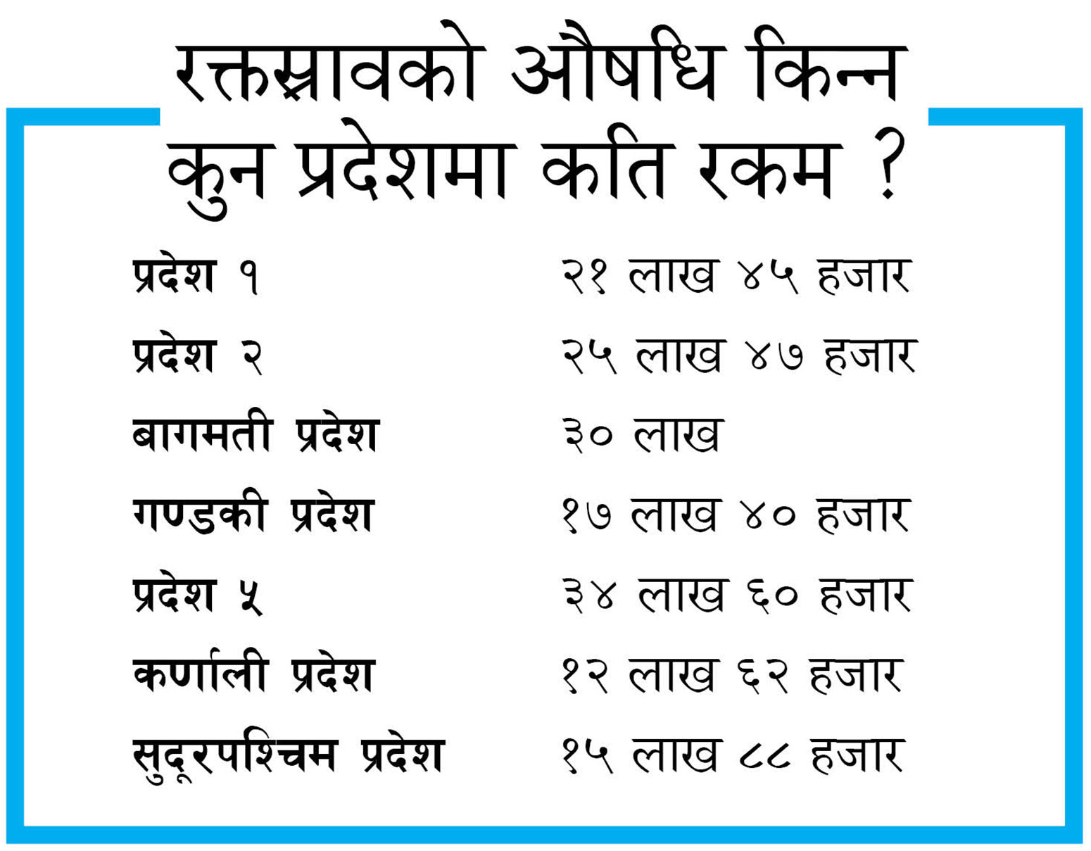 बजेट पठाइसकेको भए पनि अस्पताल र स्थानीय तहहरूले उक्त औषधि किन्न नसकेका सुदूरपश्चिम प्रदेश स्वास्थ्य निर्देशक डाक्टर गुणराज अवस्थीले बताए । प्रदेशभर नै रक्तस्राव रोक्ने औषधिको अभाव हुँदा सुरक्षित प्रसूति सेवा प्रभावित भएको उनले बताए । ‘भदौ–असोजमै पालिका र अस्पतालहरूमा बजेट गइसकेको थियो,’ डाक्टर अवस्थीले भने, ‘तर, अहिलेसम्म खरिद गरिएको छैन ।’ प्रदेशभर एक वर्षमा ६२ हजार सुत्केरी हुने भएकाले रक्तस्राव रोक्ने औषधि करिब साढे दुई लाख ट्याबलेट आवश्यक पर्ने उनले बताए ।