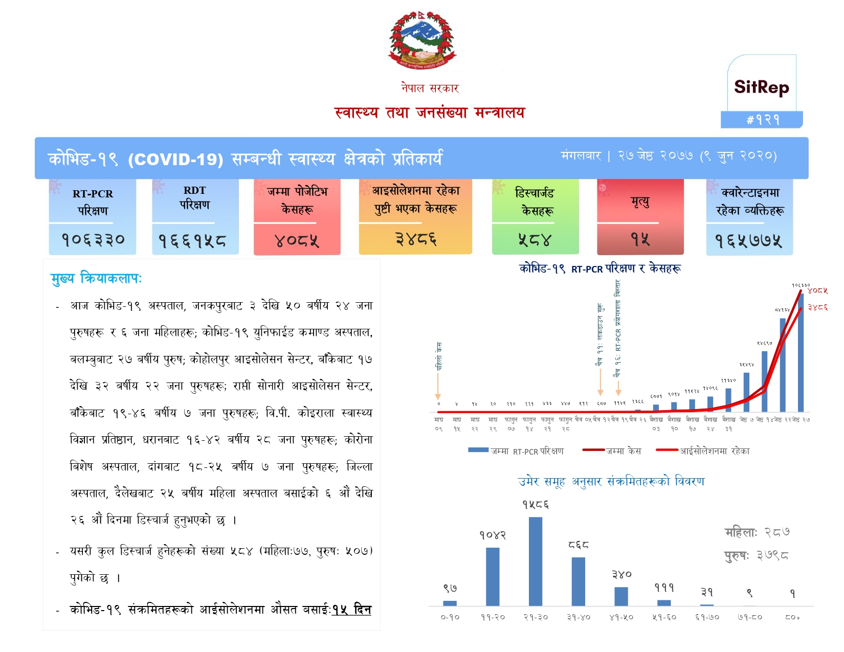 स्वास्थ्य तथा जनसंख्या मन्त्रालयले दिउसो अद्यावद्यिक गरेको विवरण अनुसार संक्रमण पुष्टि भएको संख्या ४ हजार ८५ पुगेको छ भने १५ जनाको मृत्यु भएको छ ।