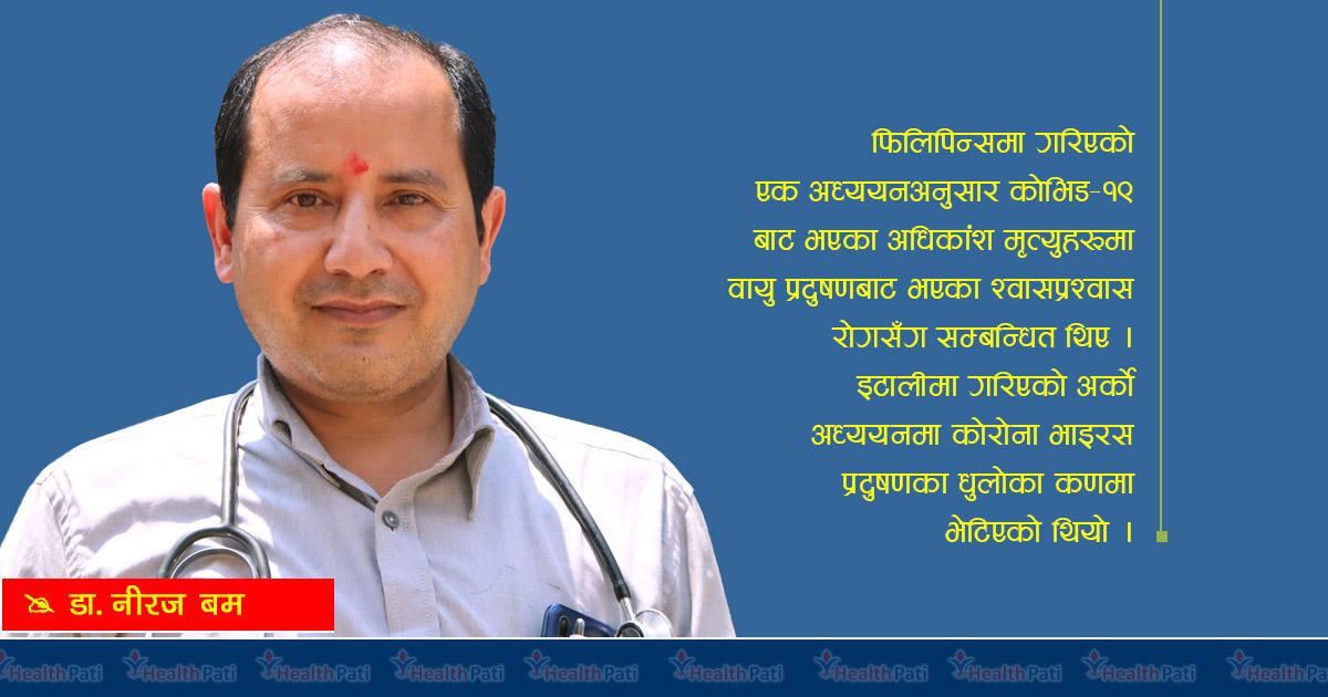 अमेरिकाको न्यूयोर्कमा ३०८० जनामा गरिएको एक अध्ययन अनुसार वायुको प्रदूषणको प्रत्यक्ष सम्पर्कमा रहेकालाई कोभिड १९ का असरहरु बढी देखिएका छन् । तसर्थ बातावरणीय प्रदूषणका असरहरुबाट बच्न हामी स्वयम् र सरकारी तथा सामाजिक स्तरबाट पहल हुनु जरुरी छ । जस्तै ः सडकको धुलो नियन्त्रण, पुराना सवारी साधनको विस्थापन, इलेक्ट्रिक इञ्जिन भएका सवारी साधन सञ्चालन,फोहोर बाल्न प्रतिबन्ध,शहरमा फोहोरको उचित व्यवस्थापन र व्यवस्थित शहरीकरणमा ध्यान दिन जरुरी छ ।