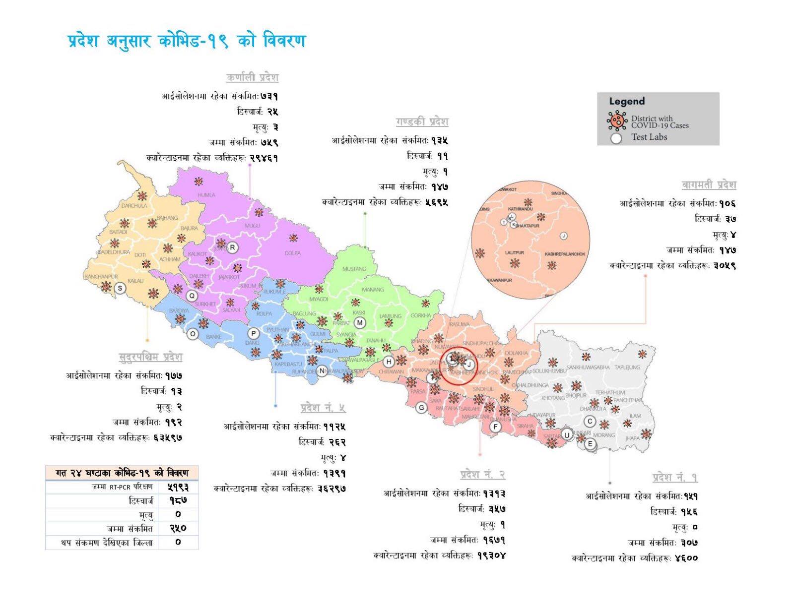 स्वास्थ्य तथा जनसंख्या मन्त्रालयले बिहीबार दिउँसो ४ बजे सार्वजनिक गरेको पछिल्लो तथ्यांक अनुसार हालसम्म कोरोनाका कारण नेपालमा १५ जनाको मृत्यु भएको छ भने ४ हजार ६१४ जनामा कोरोना पुष्टि भएको छ ।