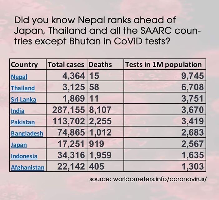 जबकी छिमेकी देश भारतमा १० लाख जनसंख्यामा ३ हजार ६७० जनाको परीक्षण भएको छ त्यहाँ २ लाख ८७ हजार १५५ जनामा कोरोना पुष्टि भइसकेको छ भने ८ हजार १०७ जनाको मृत्यु भइसकेको छ ।
