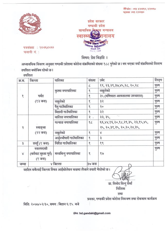 काठमाडौं । गण्डकी प्रदेशको ४ जिल्लामा थप ३७ जनालाई कोरोना भाइरस रोग (कोभिड १९) को पुष्टि भएको छ । आज बिहान ६: १५ बजेको अद्यावद्यिक अनुसार पर्वतमा १३, स्याङजामा २२, तनहुँमा १ र नवलपरासी बर्दघाटमा १ जनालाई कोरोना पुष्टि भएको छ । सबैलाई आइसोलेसनमा राख्ने तयारी भइरहेको छ । यो संगै गण्डकीमा संक्रमितको संख्या १८८ पुगेको छ ।