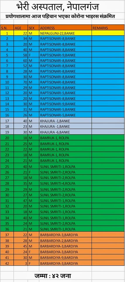 काठमाडौं । भेरी अस्पताल नेपालगञ्जमा गरिएको परीक्षणमा तीन जिल्लाका थप ४२ जनालाई कोरोना भाइरस रोगको पुष्टि भएको छ । जसमा ३ महिला र ३९ जना पुरुष रहेका छन् । अस्पतालले दिउसो १ बजे गरेको अद्यावद्यिक विवरण अनुसार बाँकेका १८ पुरुष र १ महिला तथा रोल्पाका १६ पुरुष र एक महिलालाई कोरोना पुष्टि भएको छ । ४ पुरुष र २ महिलालाई कोरोना पोजेटिभ देखिएको छ ।