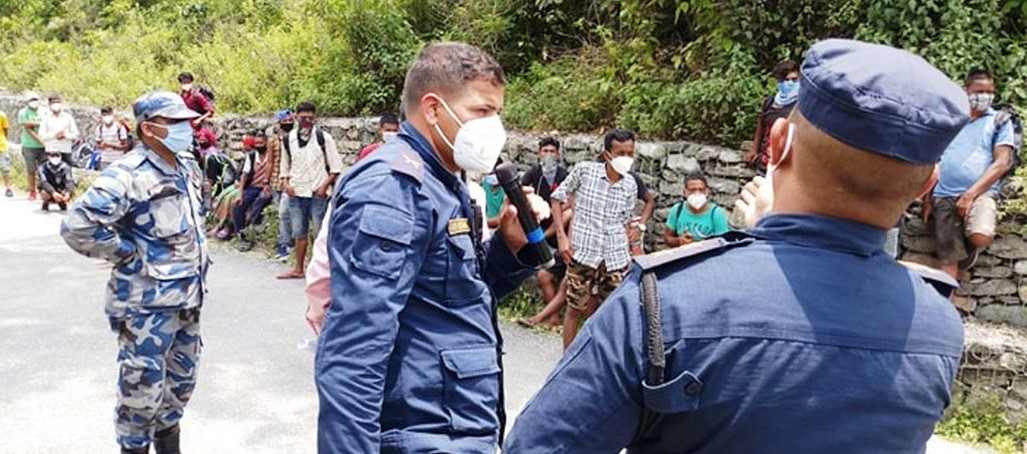आन्दोलनमा उत्रिएका कोरोना संक्रमित । उनिहरुलाई रोक्दै प्रहरी । तस्बिर :अन्नपूर्णपाेष्ट