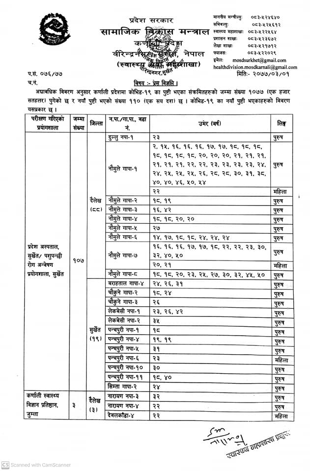 कर्णालीमा थप ११० लाई कोरोना पुष्टि, १५१ जना डिस्चार्ज