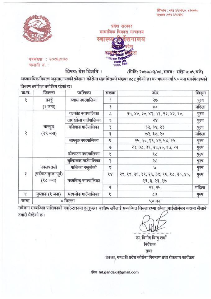 काठमाडौं । गण्डकी प्रदेशमा आजै थप ५० जनालाई कोरोना भाइरस रोग(कोभिड १९)को पुष्टि भएको छ। स्वास्थ्य निर्देशनालय गण्डकी प्रदेशको साँझ ७ : ४५ मा गरेको अद्यावद्यिक अनुसार तनहुँमा २, बाग्लुङका २९, नवलपरासीका १८ र मुस्ताङमा १ जनालाई कोरोना पुष्टि भएको छ।
