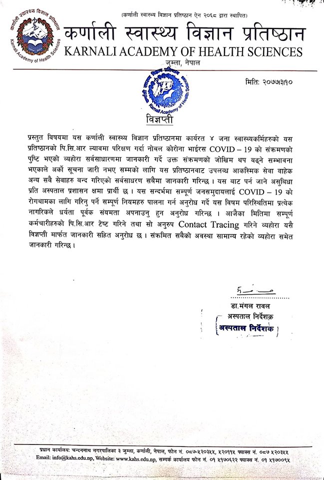 कर्णाली प्रतिष्ठानका ४ स्वास्थ्यकर्मीलाई कोरोना, अस्पतालका सेवा बन्द