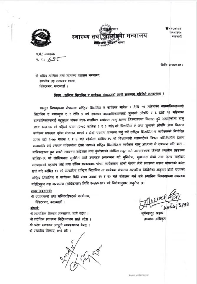 स्वास्थ्य तथा जनसंख्या मन्त्रालयले स्थानीय तहहरूमा कोभिड़ १९ को जोखिमबाट सुरक्षित रहने उपायहरु अबलम्बन गर्दै भिटामिन ए कार्यक्रम सञ्चालन गर्न सातै प्रदेशलाई निर्देशन दिएको छ ।